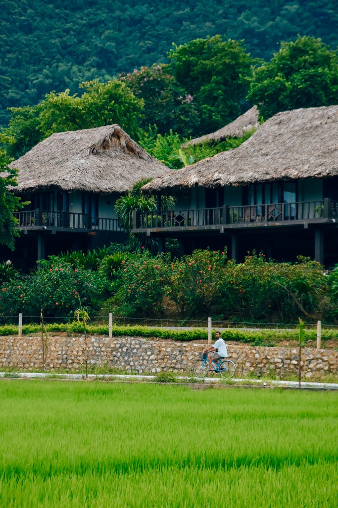 El plan en Mai Chau es pedalear por toda la zona, parando en las aldeas, donde además puedes alojarte. Un ejemplo es la aldea de Poom Coong y Lac Village. Sus casas están construidas sobre pilotes tradicionales y en muchas ocasiones verás pequeños mercaditos o puestos de artesanías y textiles, pequeños restaurantes, y por supuesto los arrozales.